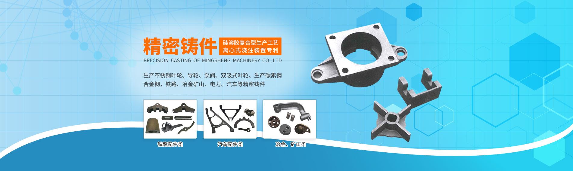 銘盛公司是一家生產不銹鋼葉輪、導輪、泵閥、雙吸式葉輪、生產碳素鋼、合金鋼,鐵路、冶金礦山、電力、汽車等精密鑄件的企業,公司具有雄厚的生產能力。采用硅溶膠復合型生產工藝,并具有離心式澆注裝置專利。質量可靠,并取得環保認可,持續生產的廠家。現有職工120名,精密鑄造工藝師3名,鑄造工程師3名,技師18名。可年生產不銹鋼800噸、碳鋼1200噸。也可按用戶需要設計加工各種精密鑄件。
